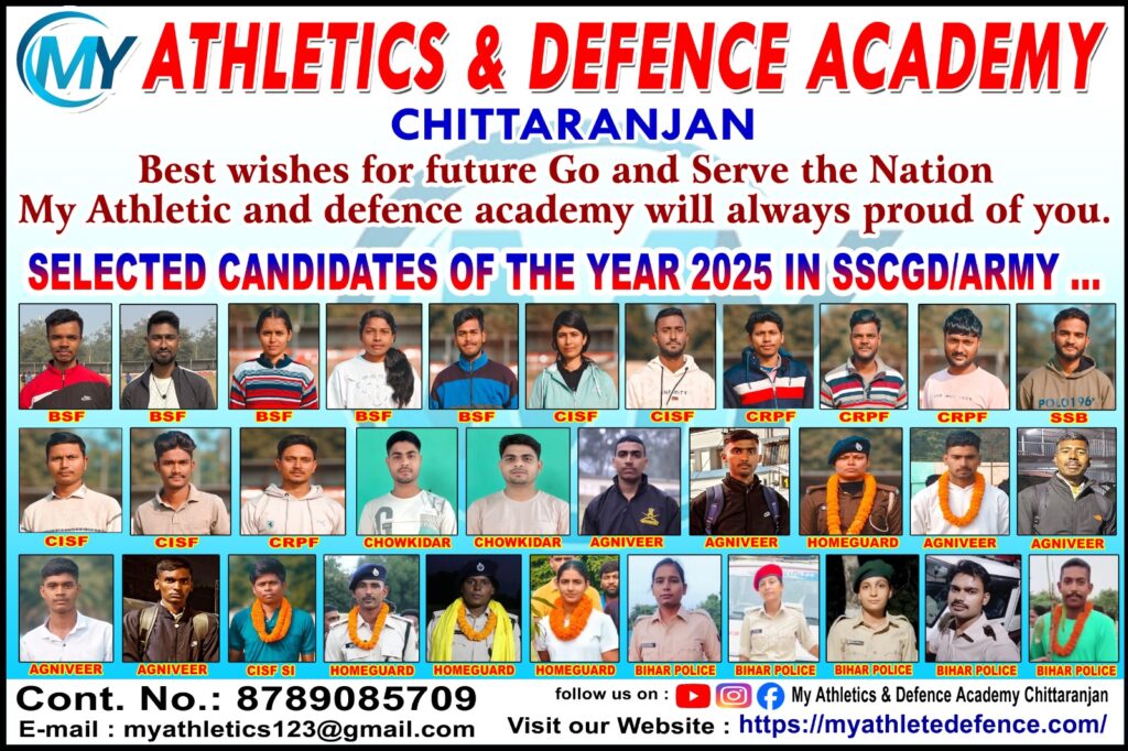 My Athletics & Defence Academy Chittaranjan proudly congratulates all our students who have been successfully selected in 2025 for various defence and security forces such as SSC GD, Indian Army, BSF, CISF, CRPF, Home Guard, Bihar Police, and Agniveer. These achievements show the hard work, discipline, and dedication of our trainees, along with the proper training and guidance provided by our academy. Each success brings pride to the students, their families, and our entire team.